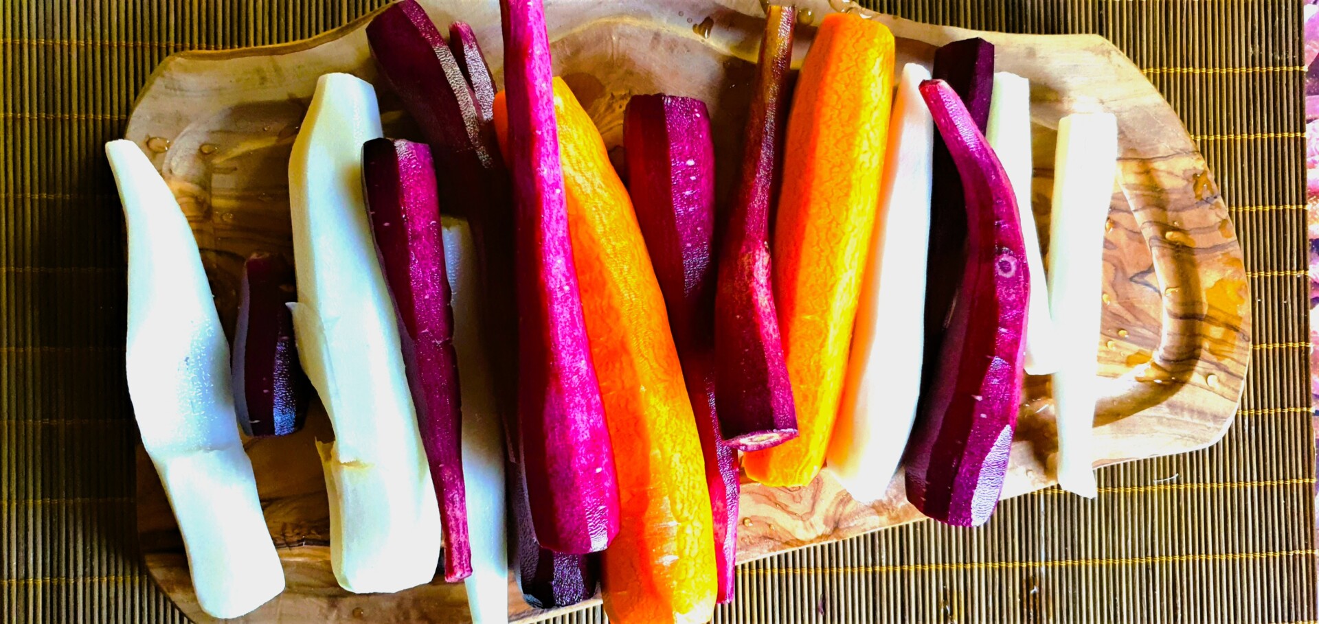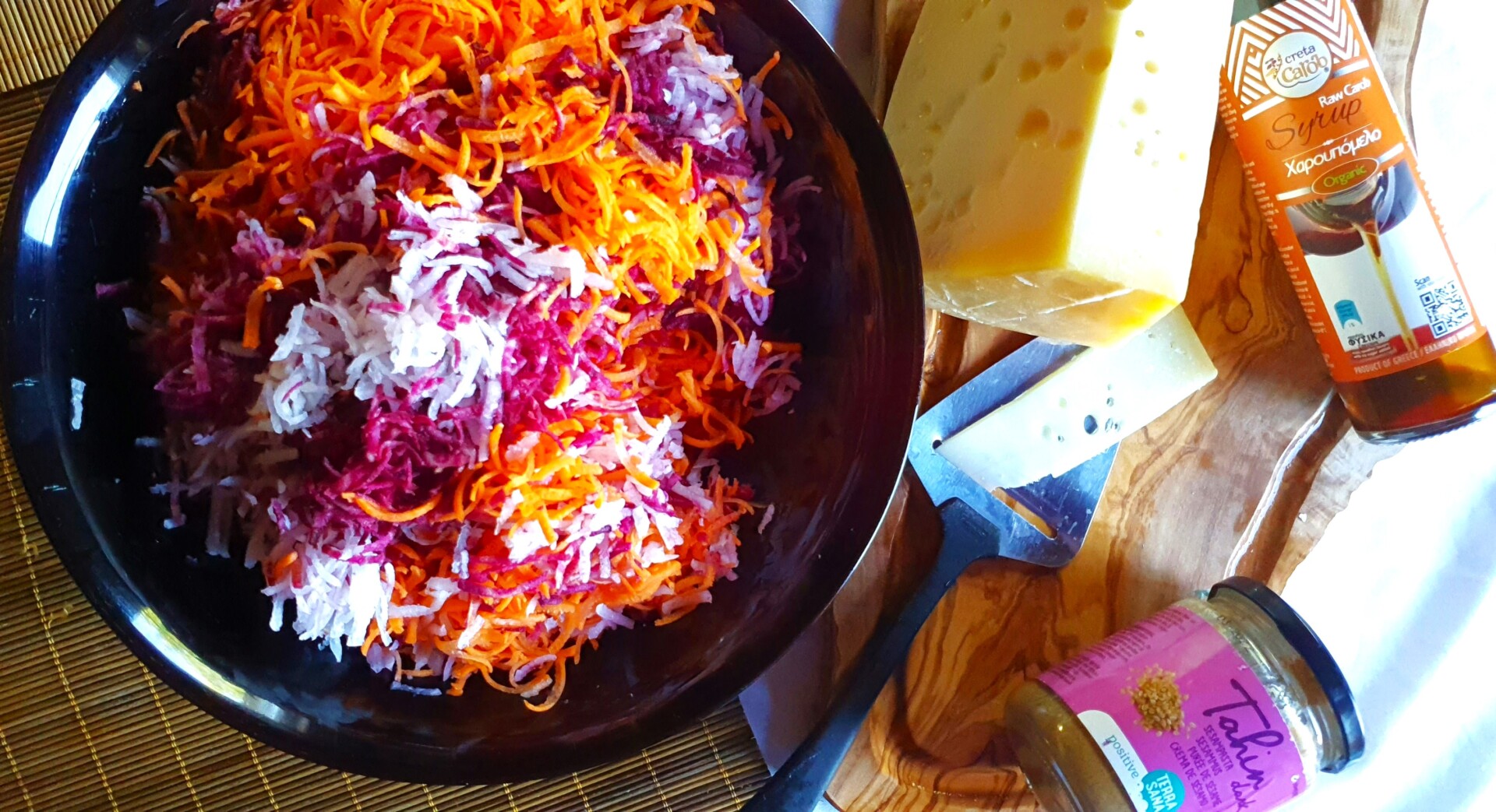 Padažui: ½ svogūno (60g) , 1 v.š. carob syrup, 20 g apelsinų sulčių, 1 v.š sezamų pastos arba riešutų sviesto be cukraus, 3 v.š. citrinos sulčių, 4 v.š. alyvuogių aliejaus, ½ a.š. druskos, žiupsnis pipirų.