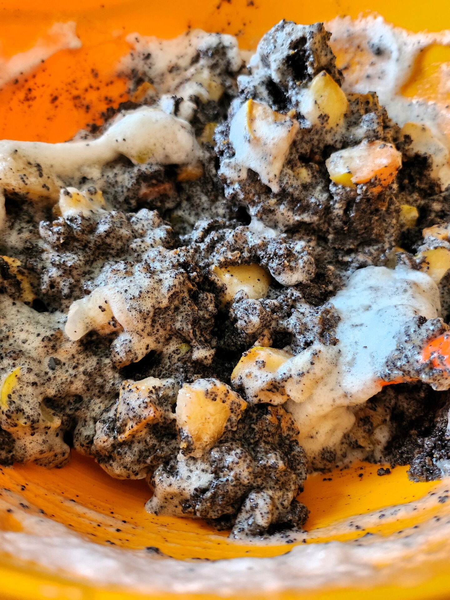 - Sudėti į smulkintuvo indą prie aguonų: išmirkytus džiovintus vaisius, trynius, jogurtą sumaišytą su soda, ištirpintą sviestą, cinamoną ir viską suplakti iki vientisos košelės. 1min./10. Išpilti į maišymo indą.