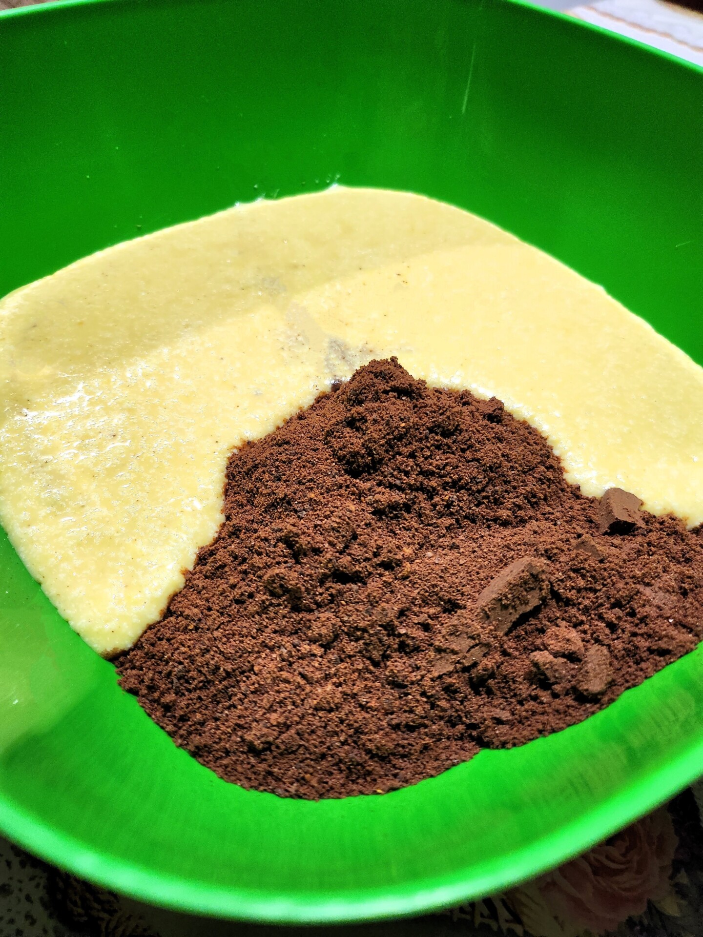 Sumaišyti kruopščiai abu sluoksnius ir paskirstyti po keksines formeles.