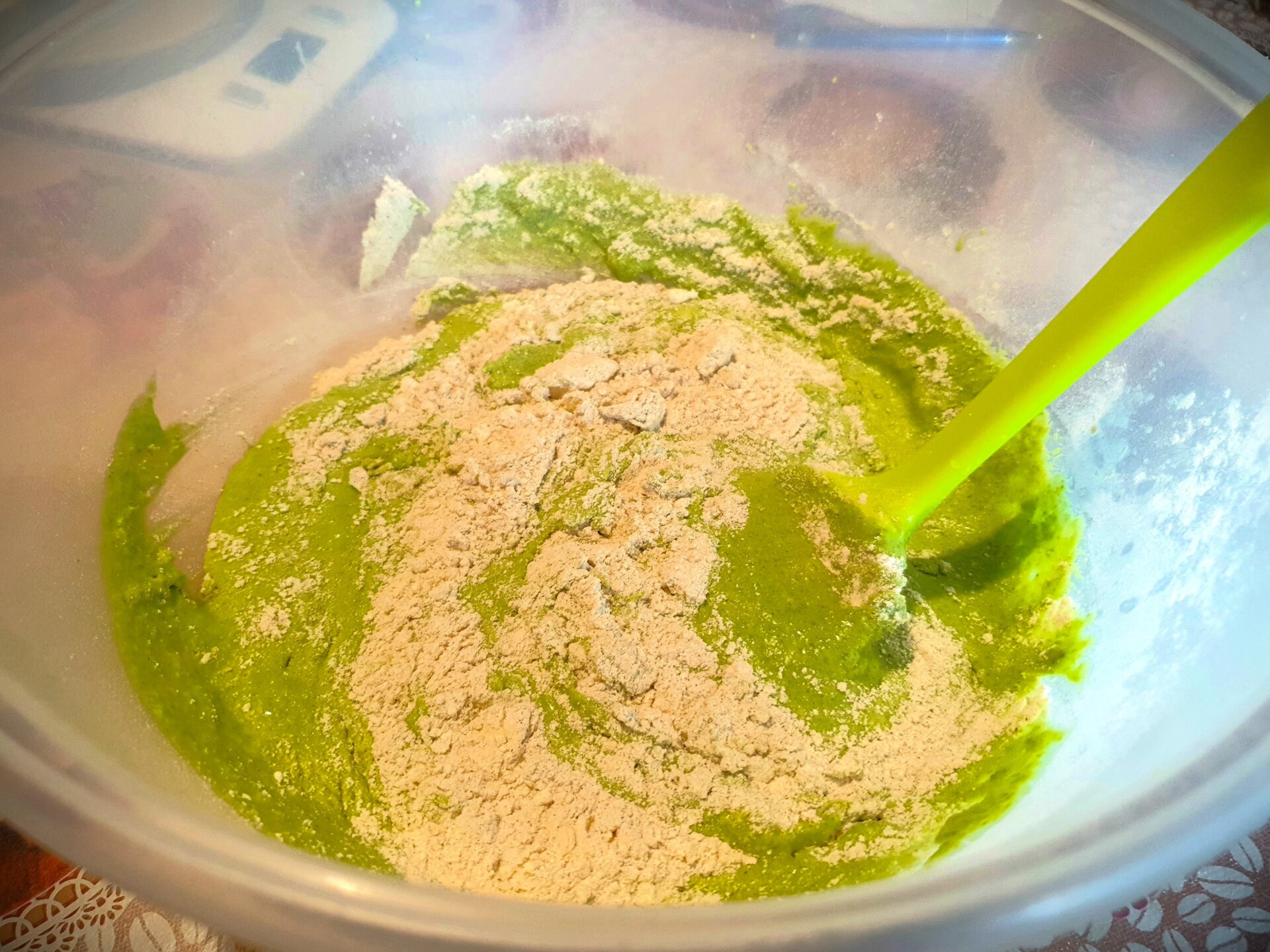 • Iš plakiklio skystą masę išpiltim prie miltų ir sumaišyti tešlą. Tešla bus minkšta, šiek tiek lips prie rankų.