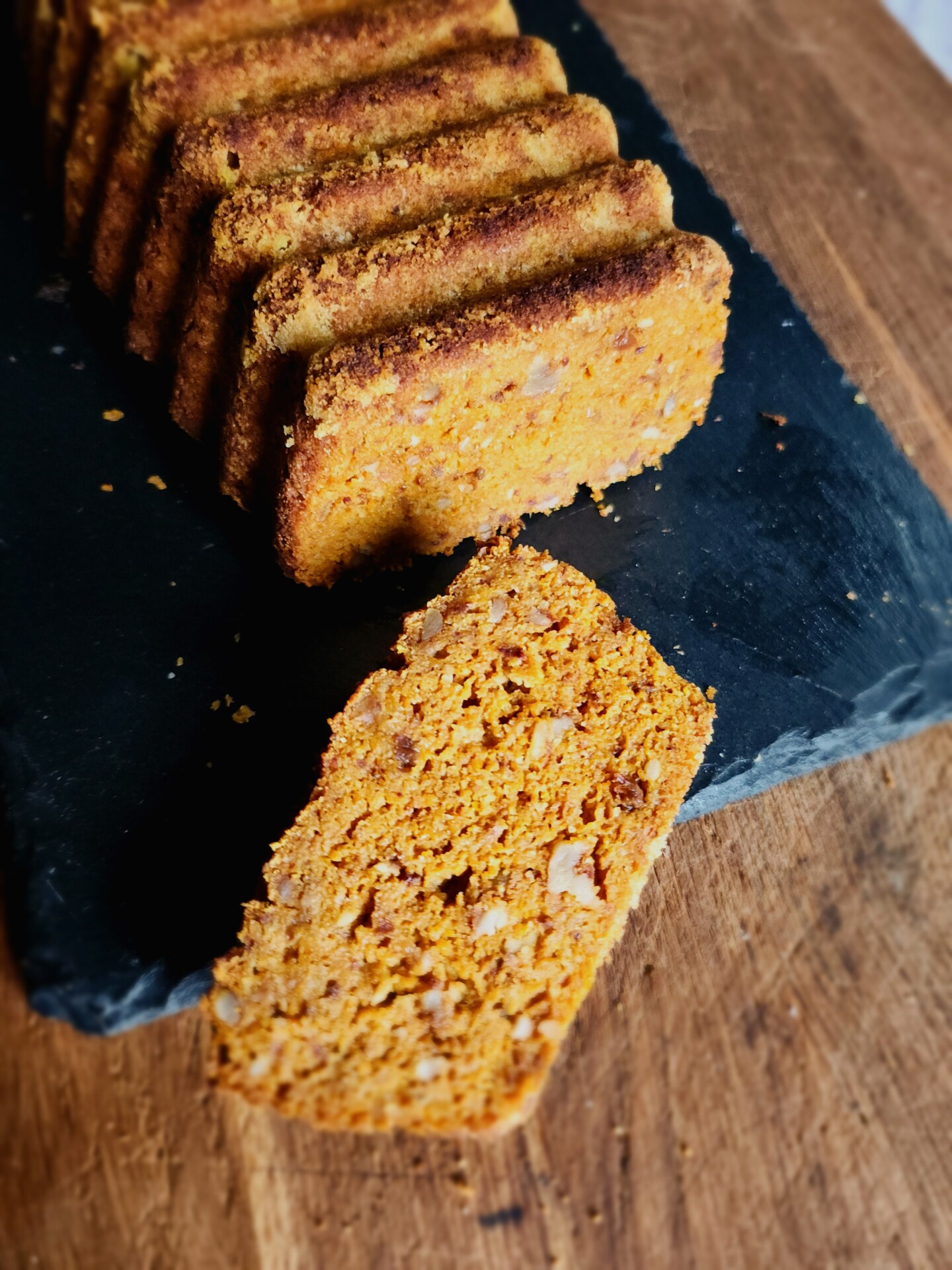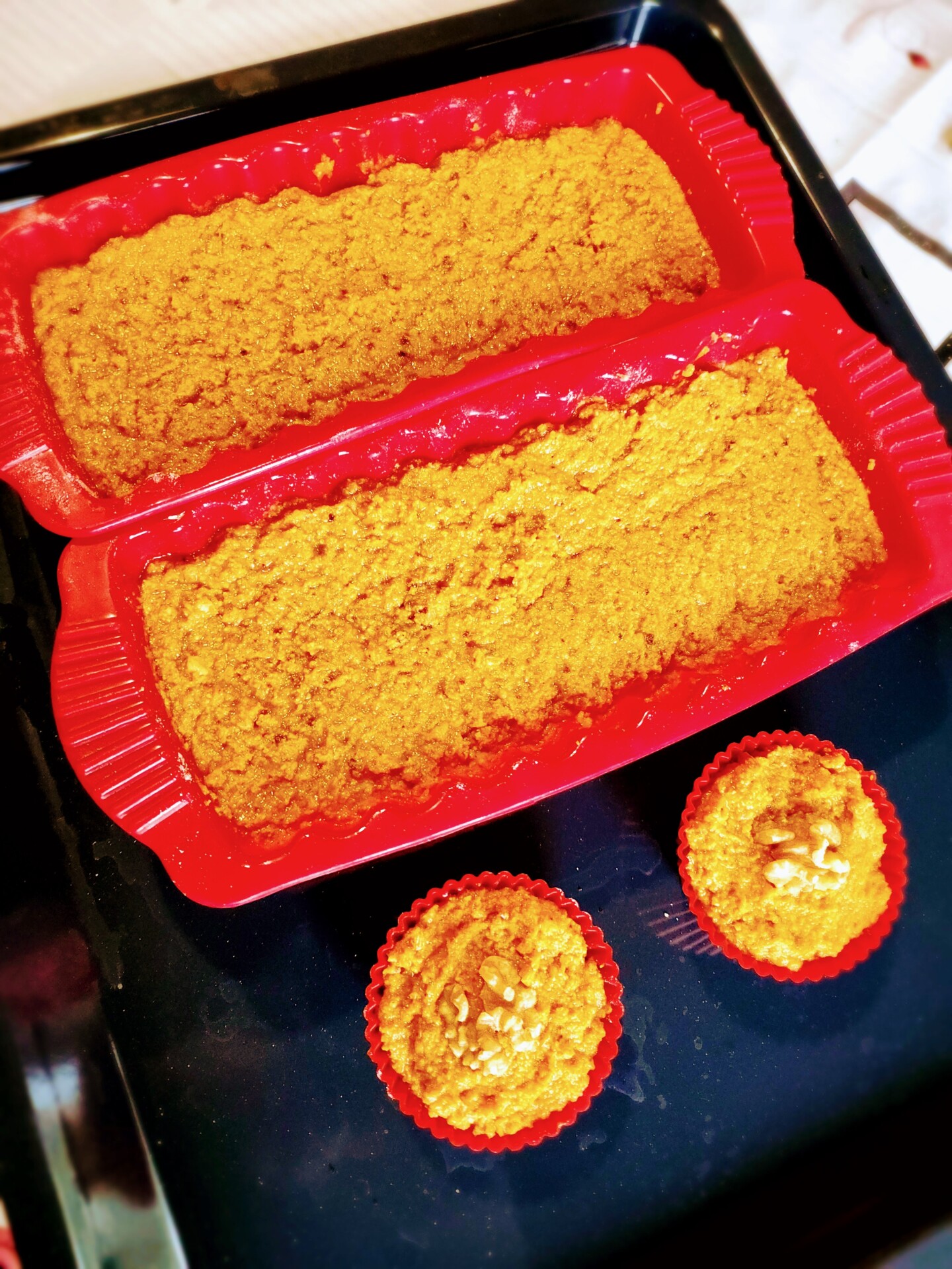 - Kepimo formas ištepti alyvuogių aliejumi, pabarstyti kokosų miltais, išdėti tešlą, pakratyti formas ar formą, kad neliktų burbulikų ir kepti apie 45-50 min./170C su oro pūtimu. Kepinys turi iškilti ir gražiai apskrusti.