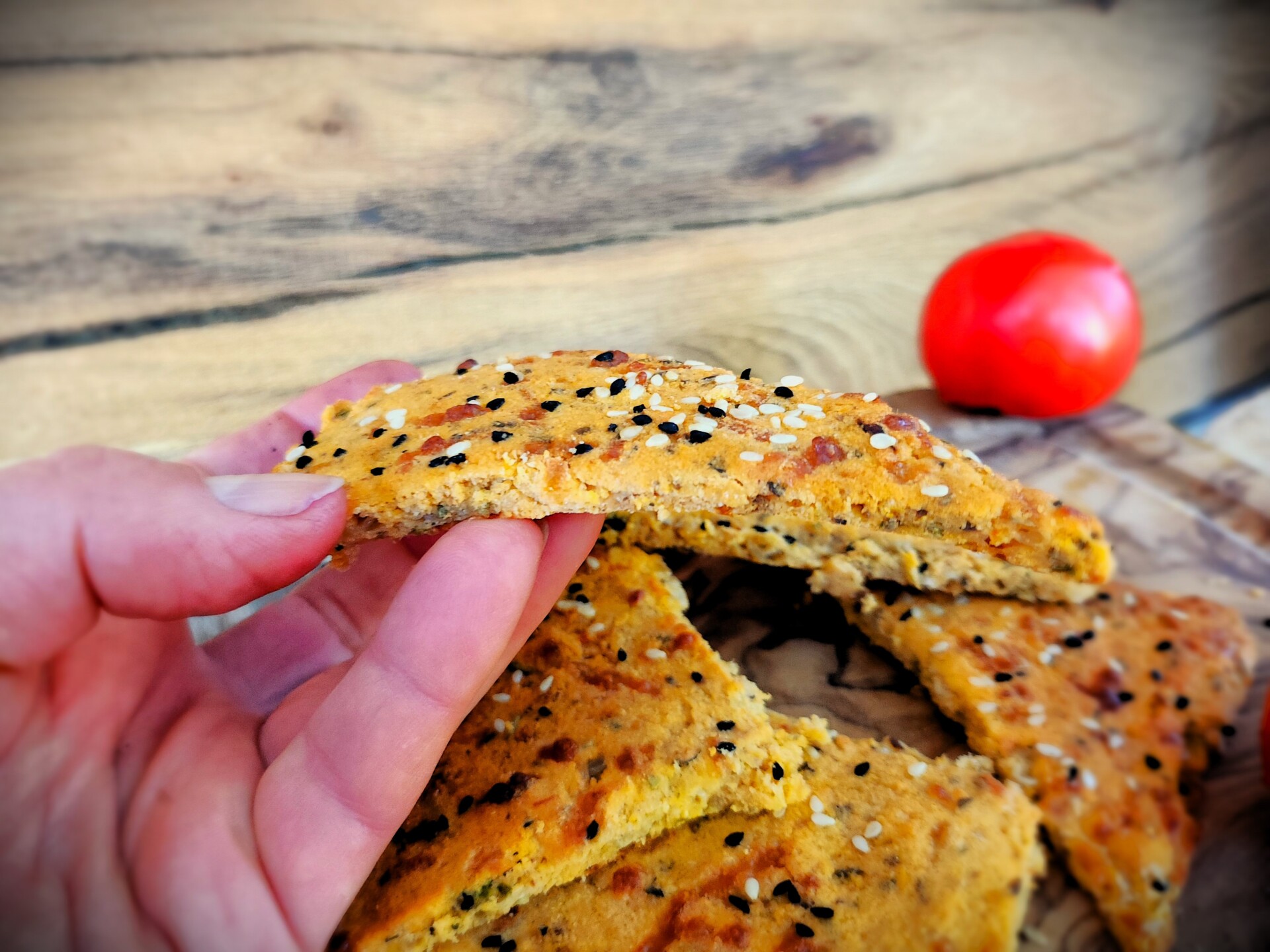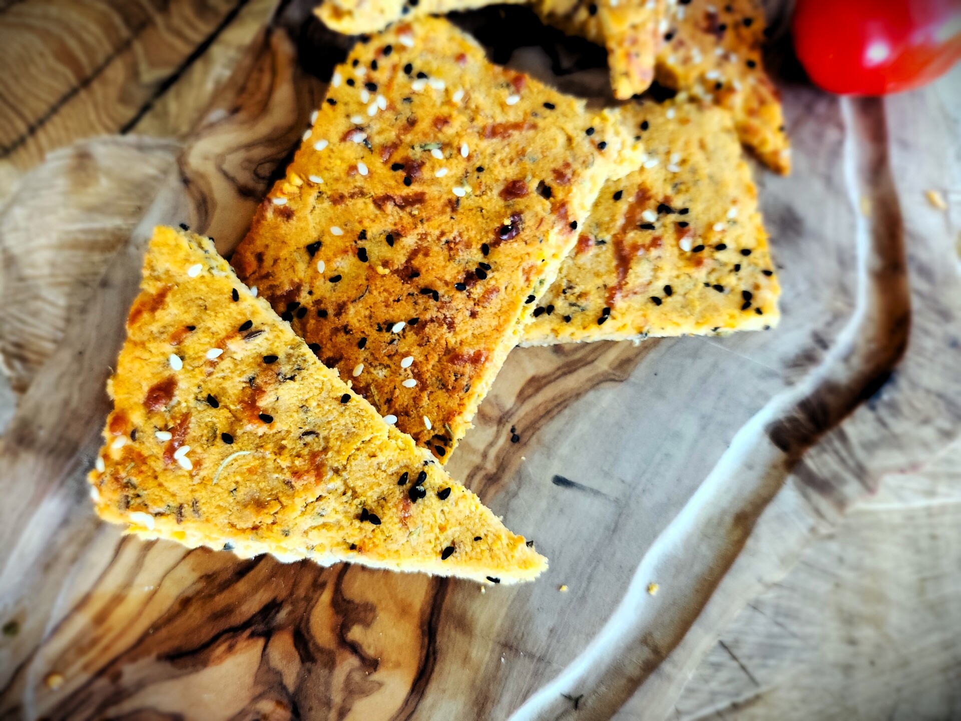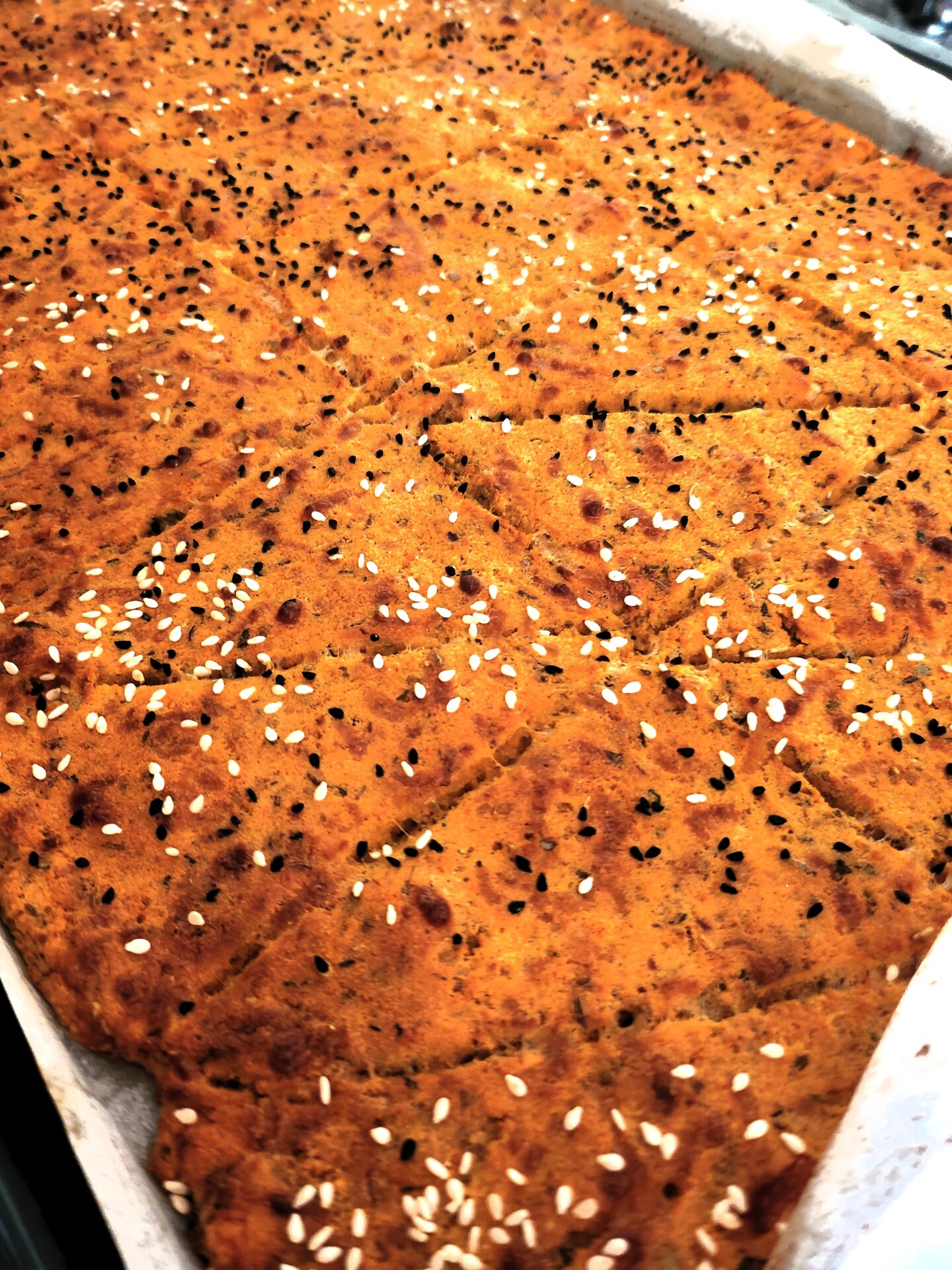 - Orkaitės skardą iškloti kepimo popieriumi ir ištepti paruoštą masę. Išlyginkite tešlą, pabarstykite sezamo sėklomis (bet nebūtinai), sudalinkite silikonine mentele norimo dydžio gabaliukais ir dėkite į įkaitintą orkaitę.
