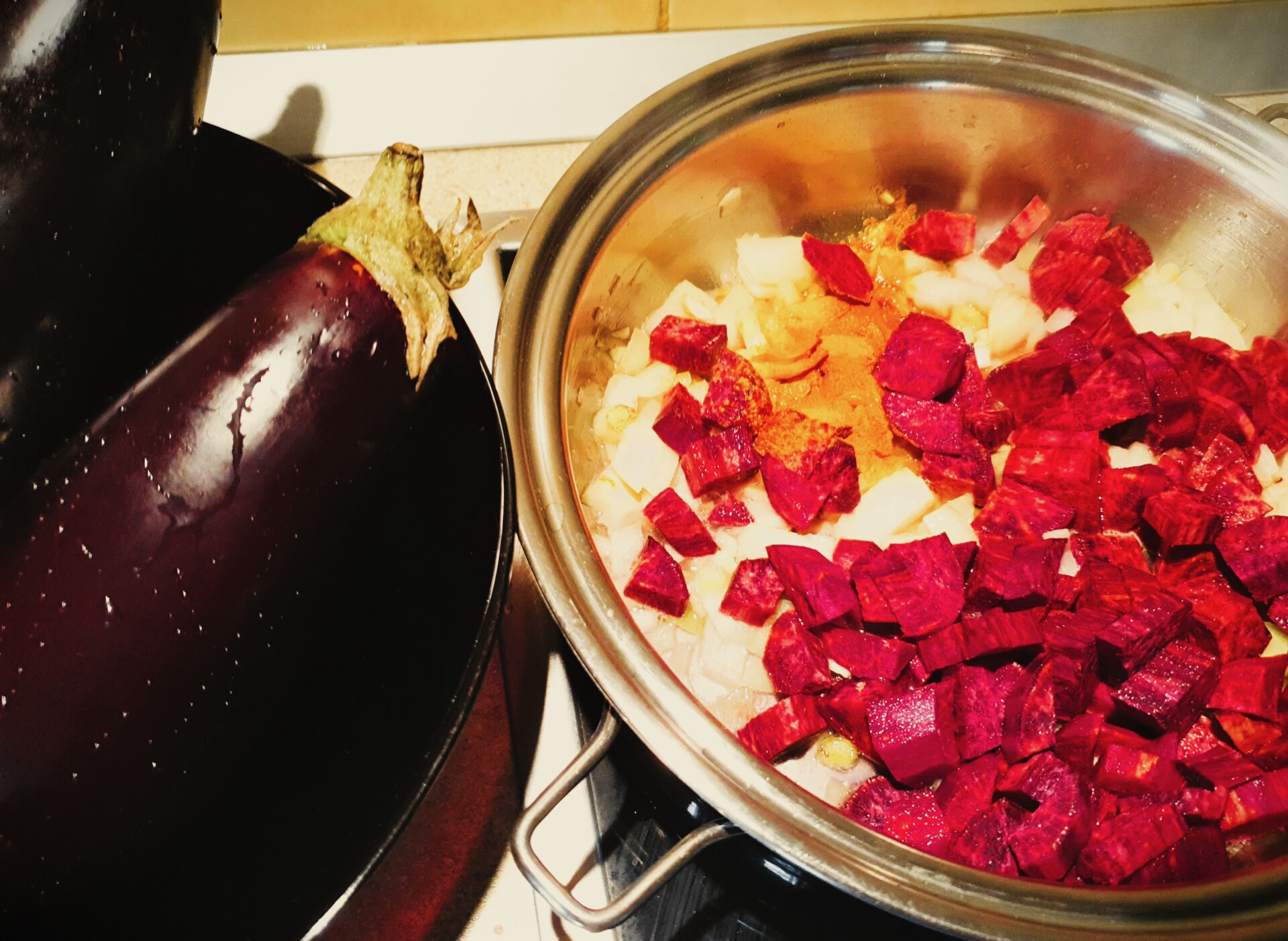- Suberti kubeliais susmulkintas mėlynasias bulves, įpiltti 2-3 v.š. vandens, uždengti ir pakaitinti 2min kol baklažanus supjaustysite kubeliais.