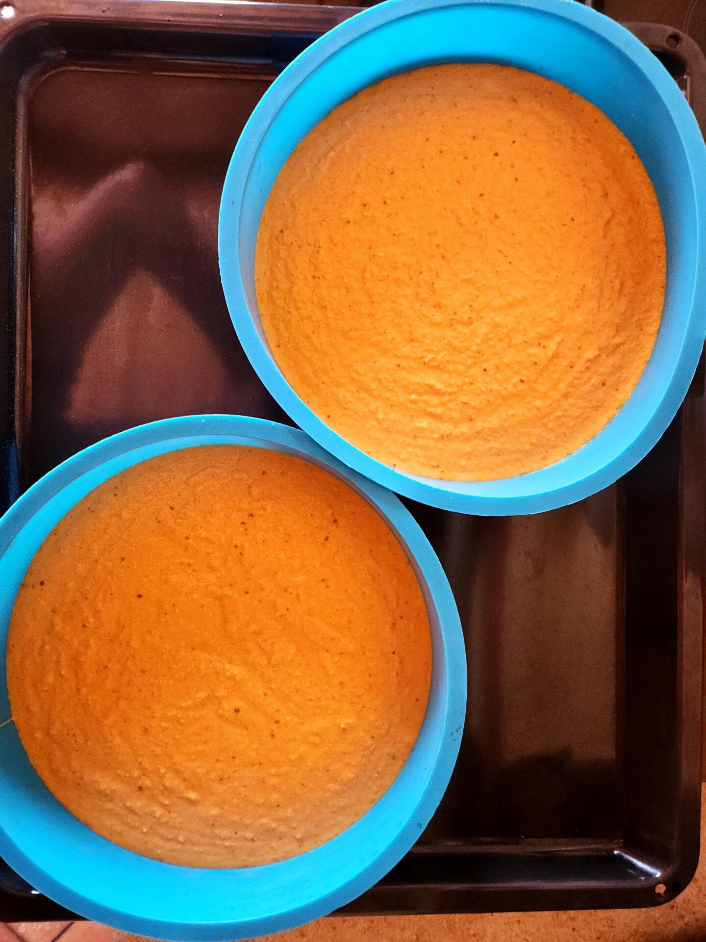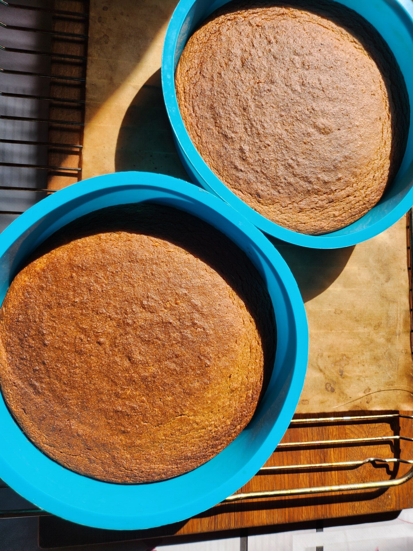 • Tešlą paskirstyti į dvi vienodas silikonines formas ir kepti apie 30 min./170C, kol gražiai apskrus ir iškils viduriukas. Atvėsinti biskvitą.